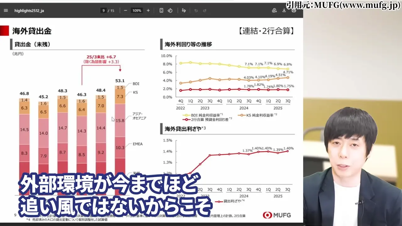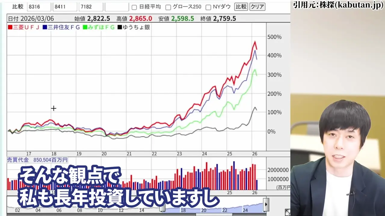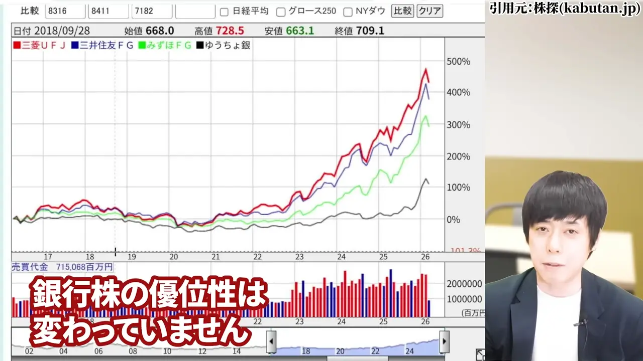ここ数年の銀行株の上昇は、業界固有の成長力というより、金利・円安・株高という外部環境の複合的な追い風によるものでした。