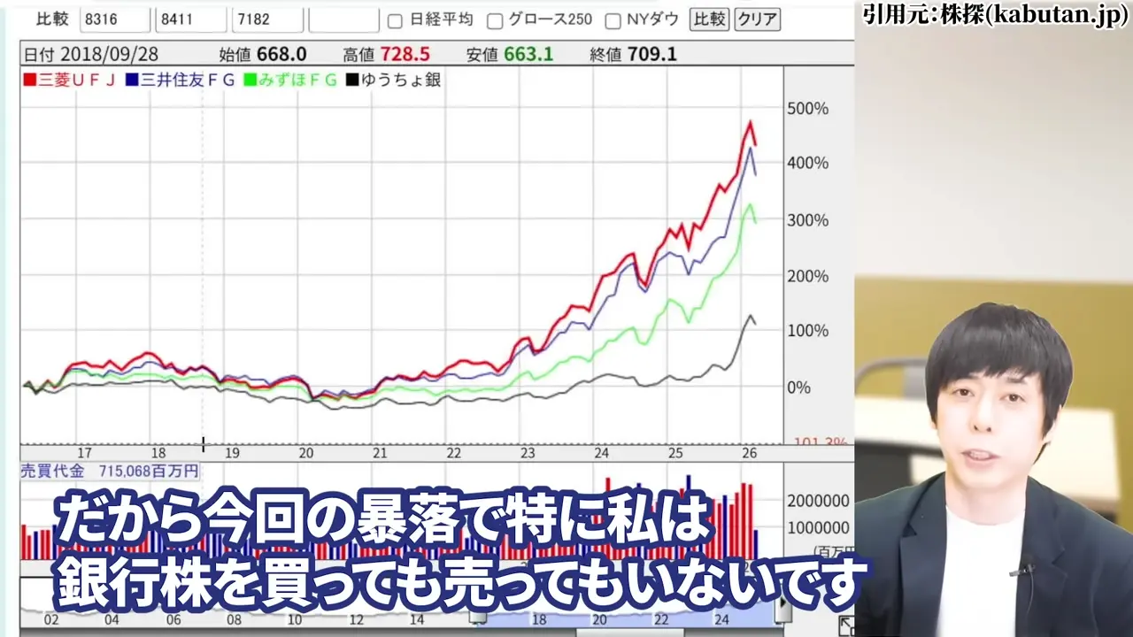 今は何も慌てずに、5〜10年先を見据えた長期投資であれば、下がっても耐えられるという前提のもとで継続保有が基本という考え方もできるかもしれません。ファンダメンタルズ的にも日本の銀行業界には長期での伸びしろを感じていますし、タイミングを見ながら少量の買い増しを検討するという選択肢もあります。 - 新規で投資を検討している方