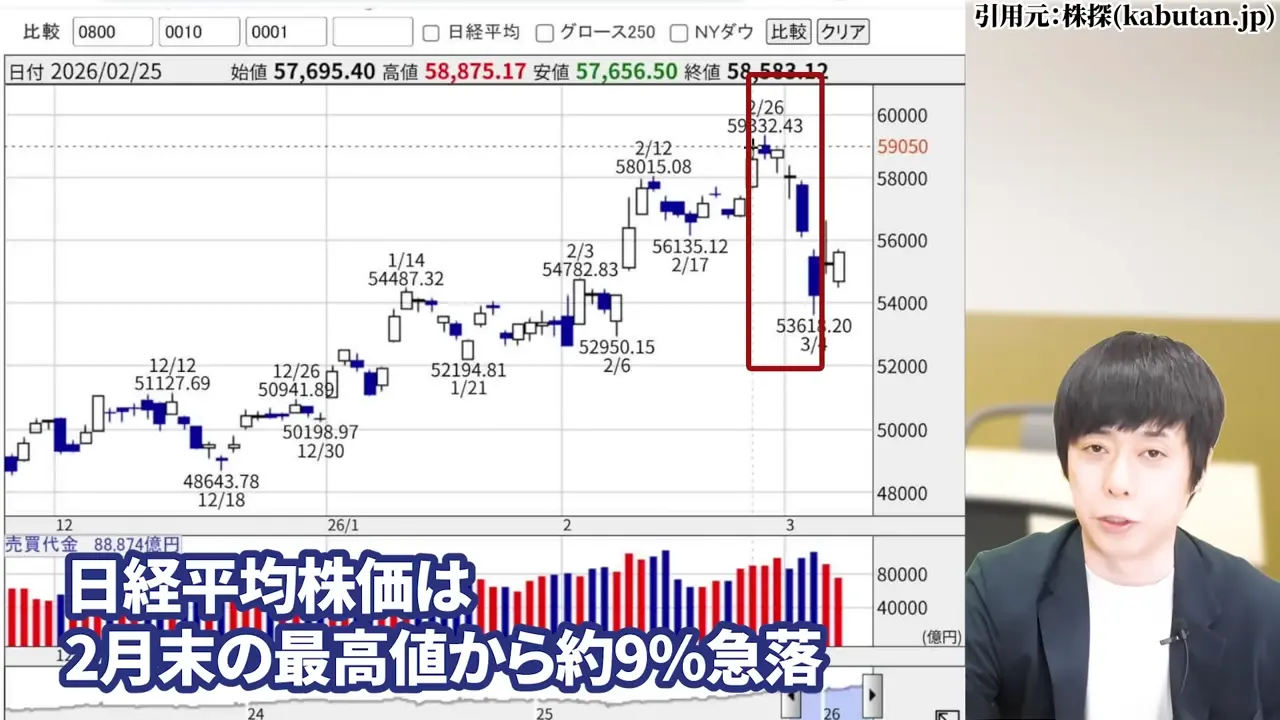 日経平均株価は2月末の最高値から約9%急落しています。