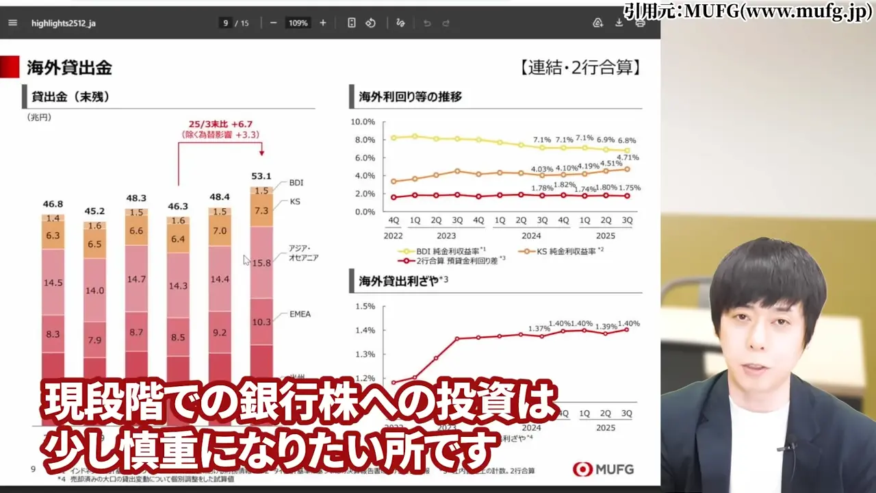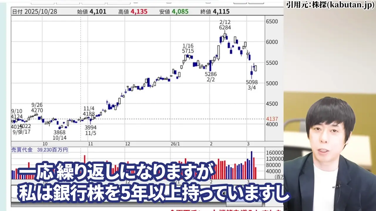今は特に動く必要はありません。継続保有で問題ないと考えています。日本のインフレトレンドと緩やかな利上げ継続が続く限り、銀行株の長期的な優位性は変わりません。タイミングを見た少量の買い増しも選択肢に入ります。 - 新規投資を検討している方