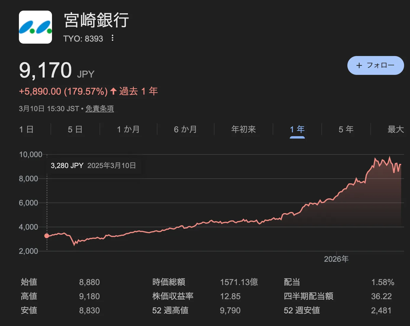 ここで取り上げる宮崎銀行の株価は、2025年7月の数字ですが、2026年3月現在。株価は9,000円を突破しています。